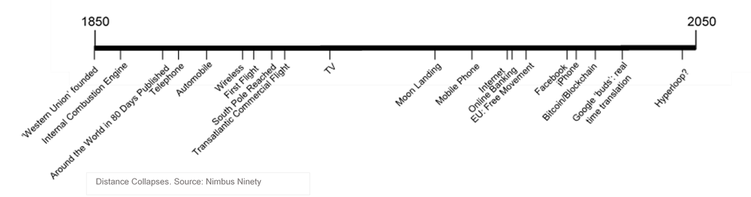 The collapse of distance is perhaps the most politicised technological trend. Travel is now brief; communication, instant. Economic globalisation has too many consequences for wealth and its distribution to list; and over the 1990s, immigration to the UK increased substantially.1 Technologies such as real-time translate earphones, or global freelance marketplaces enabled by smart contracts, will soon be implemented.
